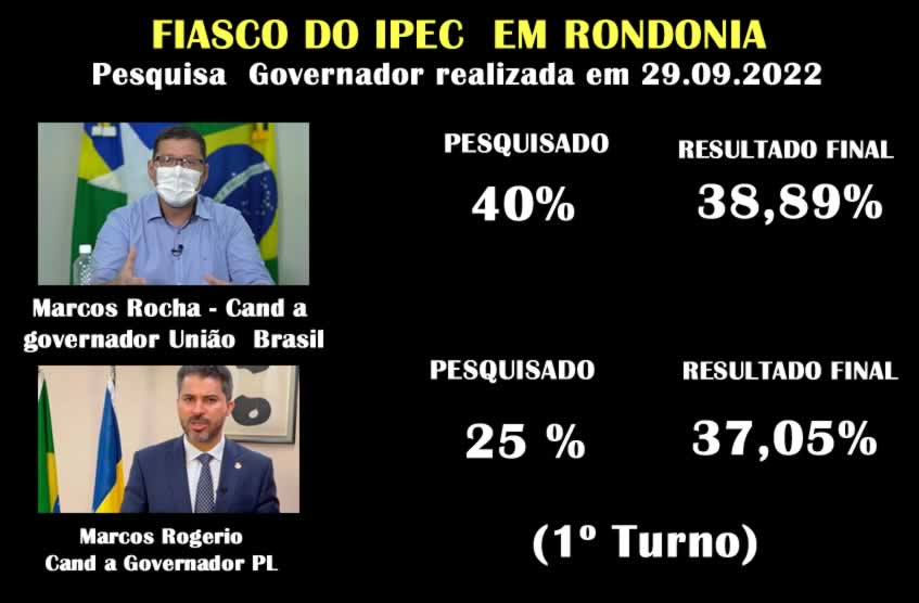 Para o governo do Estado, outro fiasco do IPEC, pois apontou marcos rocha com 43% dos votos válidos e Marcos Rogerio com 27 % dos votos validos, com margem de erro de 2.25%