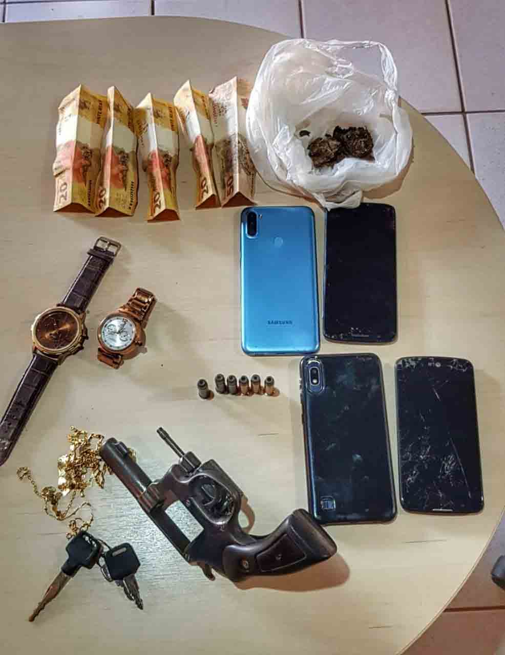 Foram localizadas aproximadamente 20 porções de drogas, escondidas em diversos lugares diferentes da residência, além de uma quantia de R$ 2.199,00 (dois mil, cento e noventa e nove reais) em dinheiro. Também foram apreendidos alguns objetos, como furadeira elétrica, celulares, relógio e uma motocicleta, cujas procedências são duvidosas.