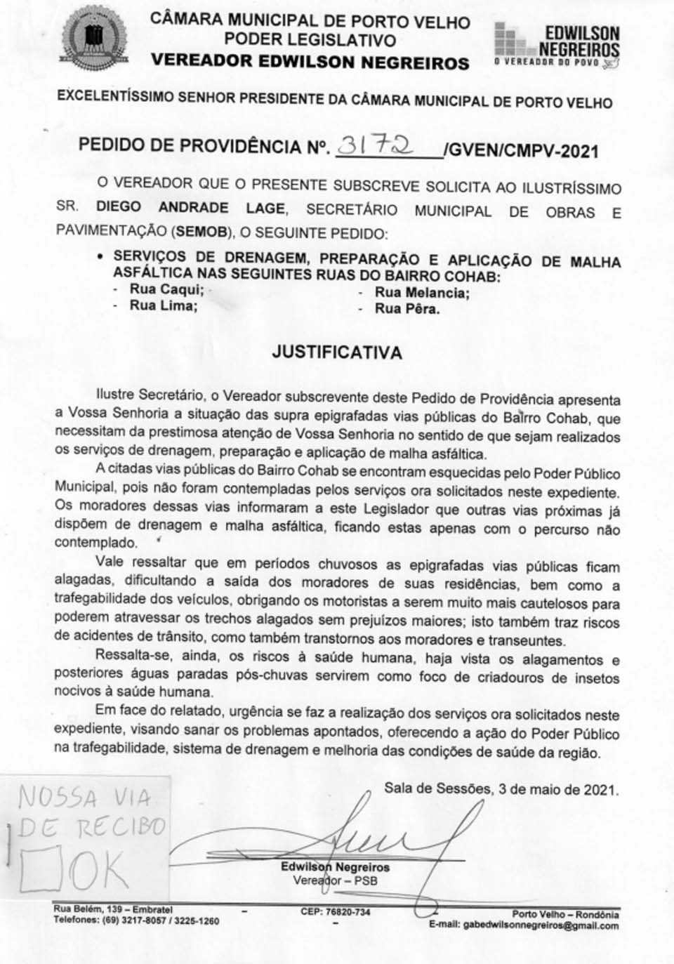 O vereador-presidente da Casa de Leis municipal Edwilson Negreiros encaminhou mais um Pedido de Providência às mãos do secretário Diego Andrade Lage, titular da Secretaria Municipal de Obras e Pavimentação (SEMOB).