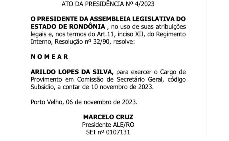 Na edição desta segunda-feira do Diário Oficial do Poder Legislativo de Rondônia, foi anunciada a nomeação de Arildo Lopes como Secretário Geral da Assembleia Legislativa do Estado de Rondônia (ALE/RO).