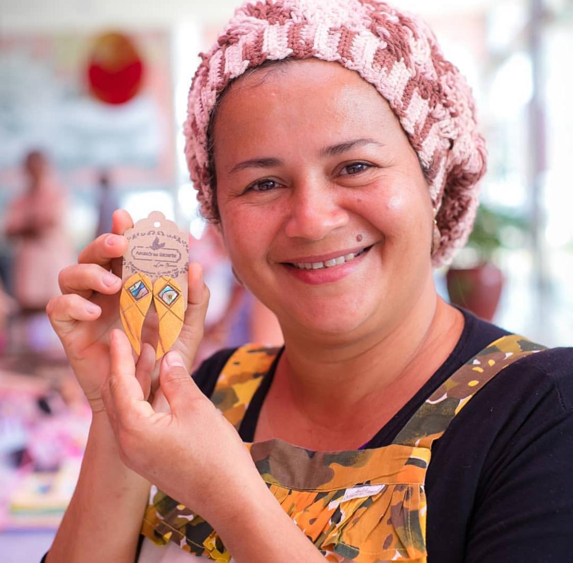 Cristiane Oliveira, 46, também rondoniense, diz que se inspira nos elementos da natureza “para dar voz, cor e vida” à sua arte. Considera-se empreendedora “florestal” há 23 anos. Também está em busca de autoconhecimento e amor à liberdade. Foi apresentada para o artesanato por sua mãe e se descobriu apaixonada pela arte quando se deparou com a arte alternativa da ecojoia, ou biojoia. Profissional há 23 anos, aproveita toda semente, madeira e demais matérias-primas típicas da região norte para produzir lindas biojoias.