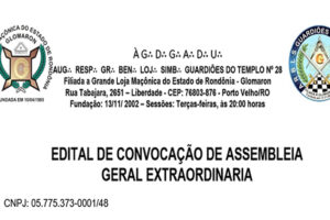 a Augusta e respeitavél Grande Benemérita Loja Simbólica Guardiões do Templo 28, convoca por meio de Edital todos os asscociados para a Assembleia Geral Extra...