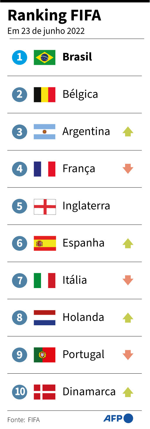 A Itália é a única seleção no top-10 que não disputará a Copa do Mundo do Catar, entre novembro e dezembro deste ano. A Alemanha, por outro lado, sequer aparece entre as dez melhores da lista divulgada pela entidade máxima do futebol.
