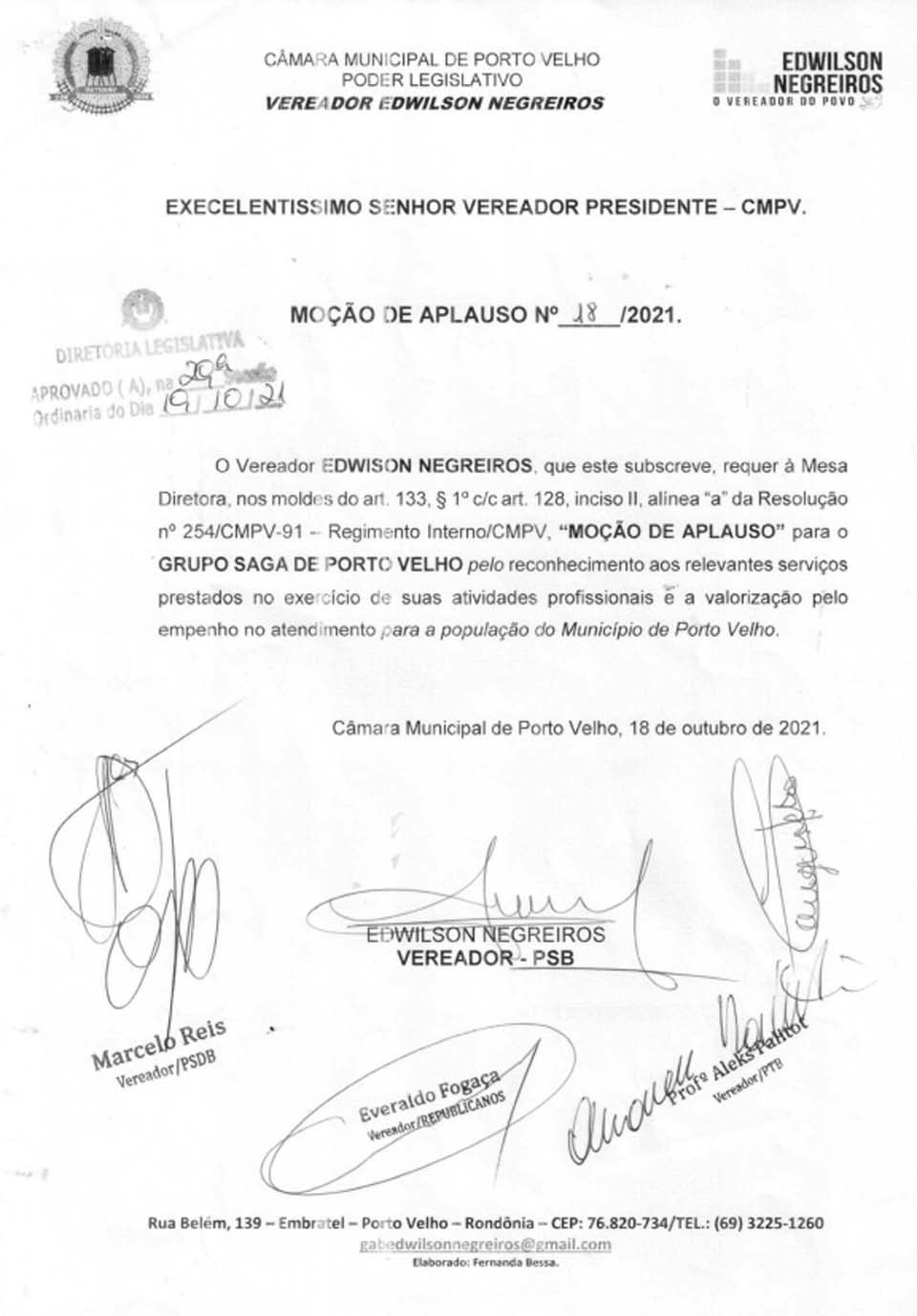 A Câmara de Porto Velho aprovou a Moção de Aplausos para o Grupo Saga.