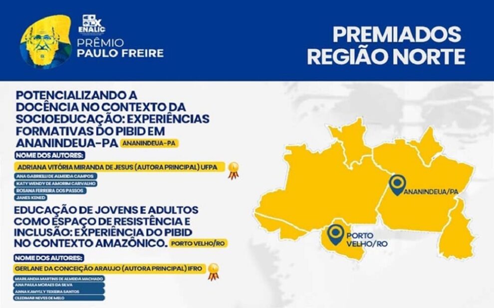 O Instituto Federal de Educação, Ciência e Tecnologia de Rondônia (IFRO), Campus Porto Velho Zona Norte, conquistou reconhecimento nacional ao ter um trabalho selecionado entre os vencedores do Prêmio Paulo Freire. A premiação é parte da programação do X Encontro Nacional das Licenciaturas (Enalic) e do IX Seminário Nacional do PIBID, eventos que acontecerão de 7 a 10 de dezembro de 2025, na Universidade de Brasília (UnB), ocasião em que os trabalhos premiados serão apresentados.