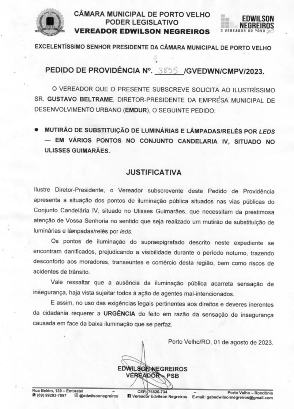 O vereador da Câmara da Capital Edwilson Negreiros, do PSB, pediu providências e a Prefeitura de Porto Velho determinou mutirão de iluminação pública na zona Leste.