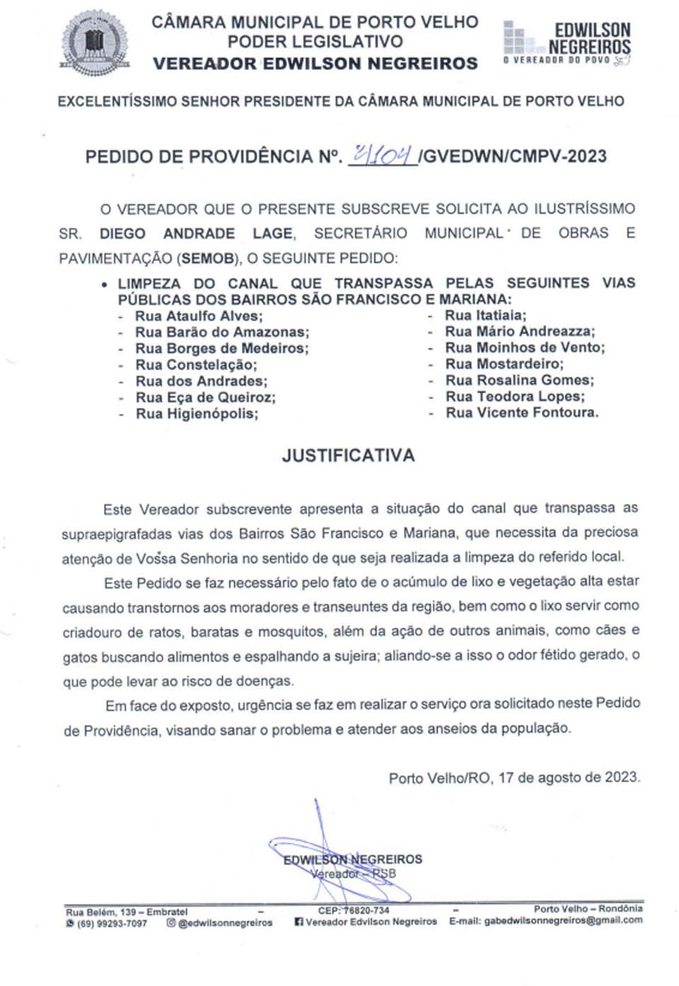 O vereador da Câmara Municipal Edwilson Negreiros, do PSB, encaminhou novo Pedido de Providências à Prefeitura de Porto Velho para atender o Bairro São Francisco, situado à Zona Leste da Capital.