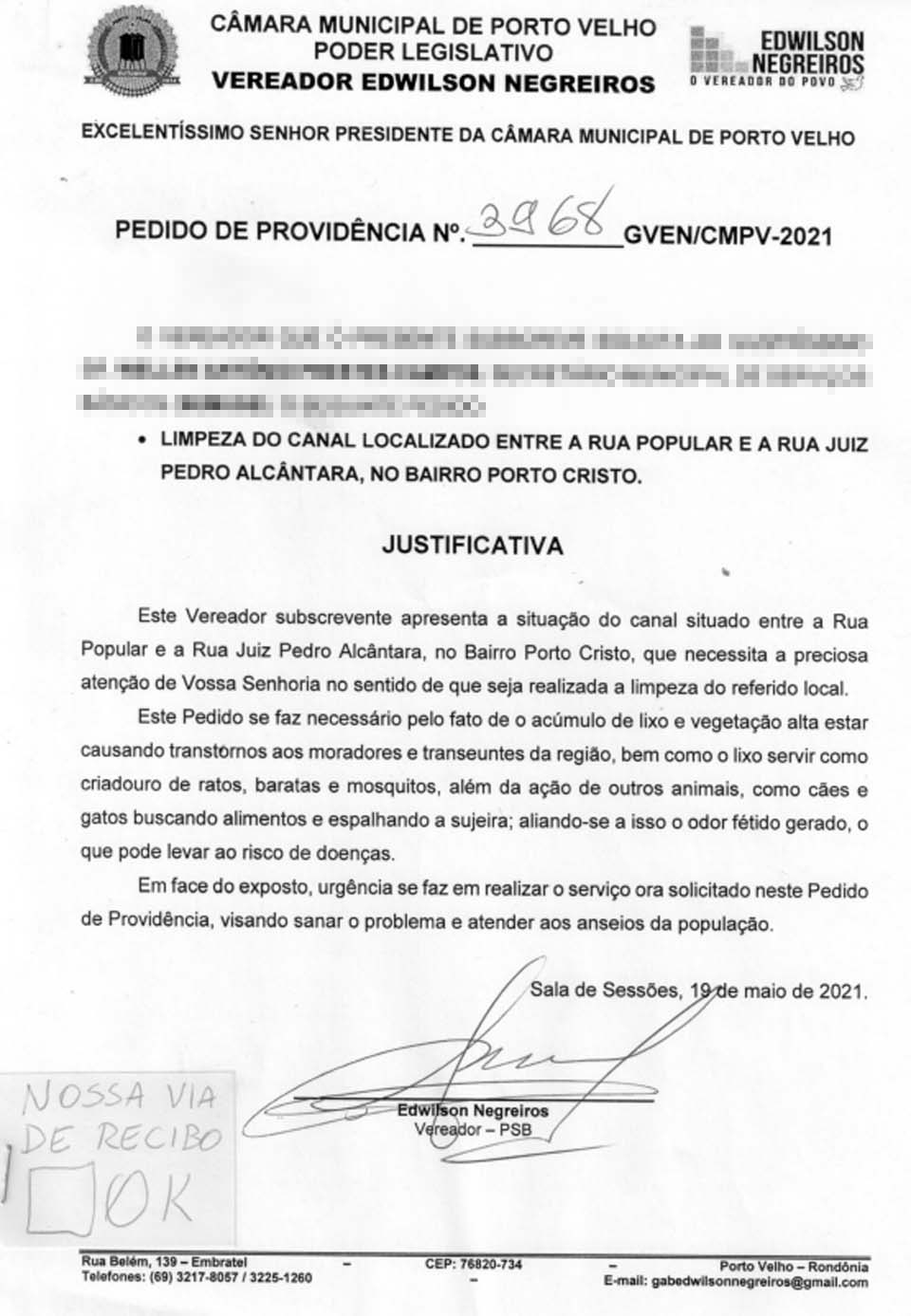 O vereador-presidente da Câmara Municipal Edwilson Negreiros, do PSB, encaminhou novo Pedido de Providências à Prefeitura de Porto Velho para atender mais uma vez o Bairro Porto Cristo, situado à Zona Leste da Capital.
