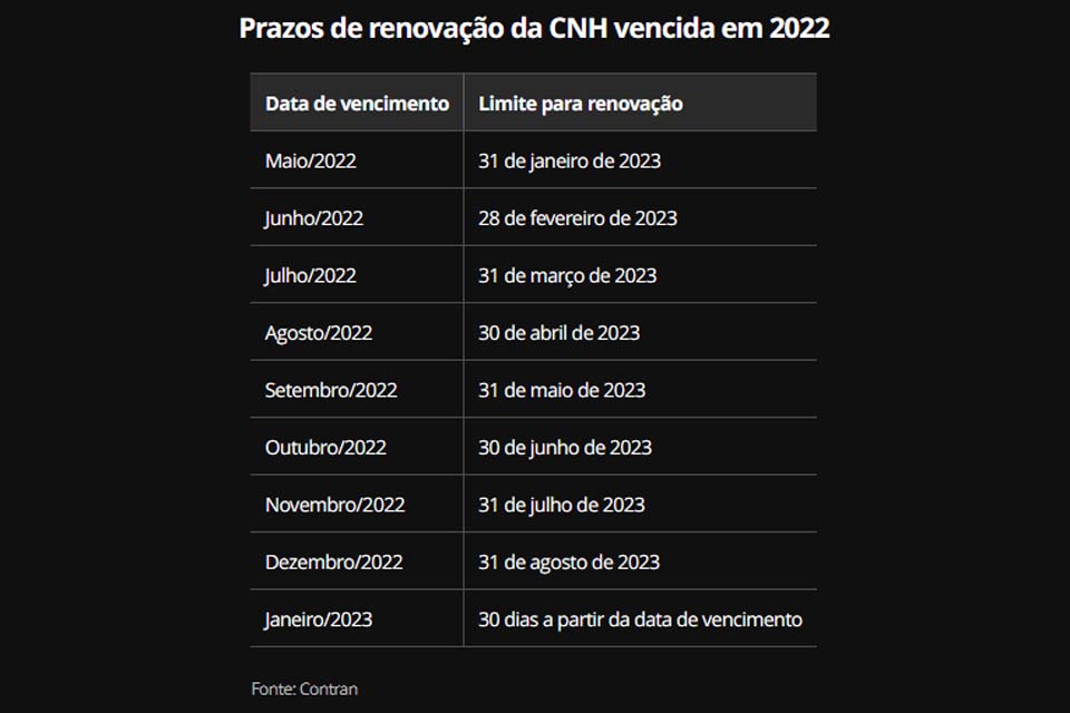 Por fim, o motorista que teve seu documento vencido entre maio e dezembro de 2022 ainda poderá se beneficiar dos oito meses adicionais. Confira o cronograma abaixo: