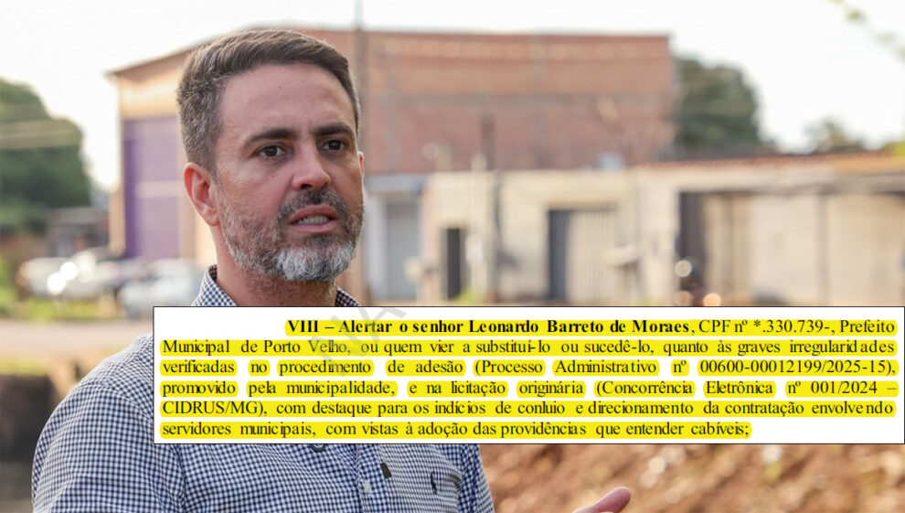 O conselheiro Paulo Curi Neto, membro do Tribunal de Contas de Rondônia, decidiu nesta segunda-feira (16), proibir a gestão do prefeito Léo Moraes de emitir Ordem de Serviço ou pagamento dos empenhos à empresa Plator Engenharia e Meio Ambiente Ltda, em razão das graves irregularidades constatadas no contrato assinado após carona a Ata de Registro de Preço do consórcio mineiro CIDRUS. O Corpo Técnico do Tribunal de Cotas “evidenciou diversas irregularidades graves com destaque para indícios de conluio entre agentes públicos municipais e a empresa contratada, o que resultou no direcionamento em favor desta, em afronta aos princípios da impessoalidade, da isonomia e da seleção da proposta mais vantajosa para a Administração”.