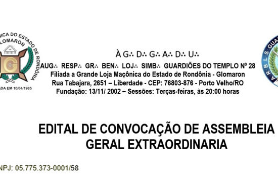 a Augusta e respeitavél Grande Benemérita Loja Simbólica Guardiões do Templo 28, convoca por meio de Edital todos os asscociados para a Assembleia ...