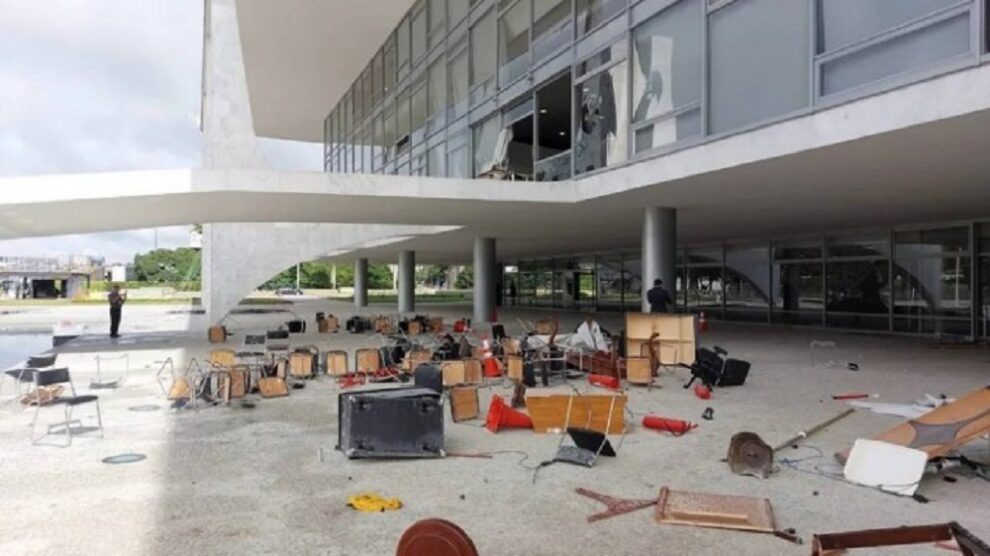 Um dia após os palácios do Planalto, do Congresso Nacional e do Supremo Tribunal Federal terem sido invadidos por golpistas, o cenário é de devastação na Praça dos Três Poderes nas primeiras horas desta segunda-feira.