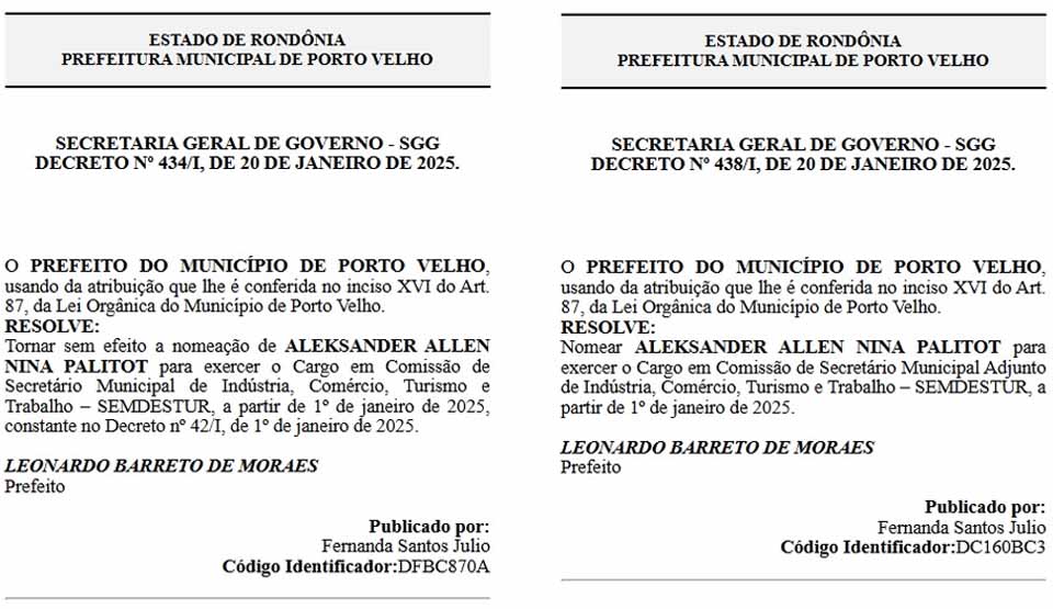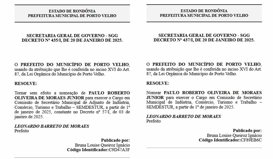 A Prefeitura Municipal de Porto Velho, sob a gestão do prefeito Léo Moraes, do Podemos, oficializou, no dia 20 de janeiro de 2025, mudanças nos cargos de liderança da Secretaria Municipal de Indústria, Comércio, Turismo e Trabalho (SEMDESTUR). A movimentação foi formalizada por meio de decretos assinados pelo prefeito e publicados no Diário Oficial do município.