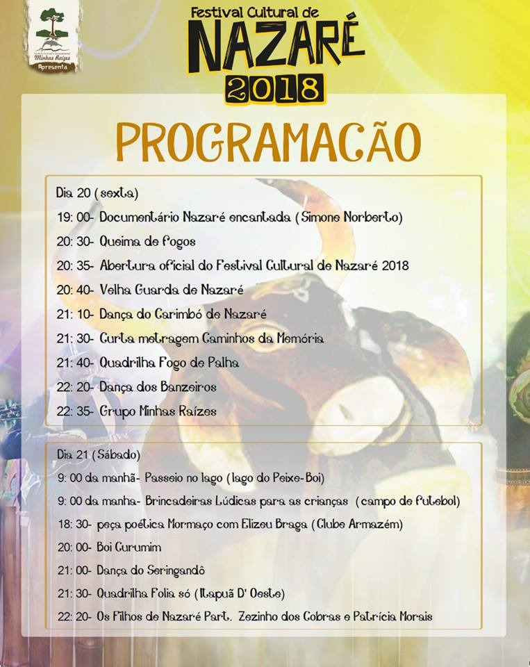 Começa nesta sexta-feira, 20, a partir das 19 horas, o Festival Cultural de Nazaré, promovido pelos moradores do distrito, com o apoio da Prefeitura de Porto Velho, por meio da Funcultural. O evento encerra neste sábado, 21, à noite. O distrito de Nazaré está localizado na margem esquerda do rio Madeira. Este ano, a novidade será o passeio de barco pelo Lago do Peixe-Boi.