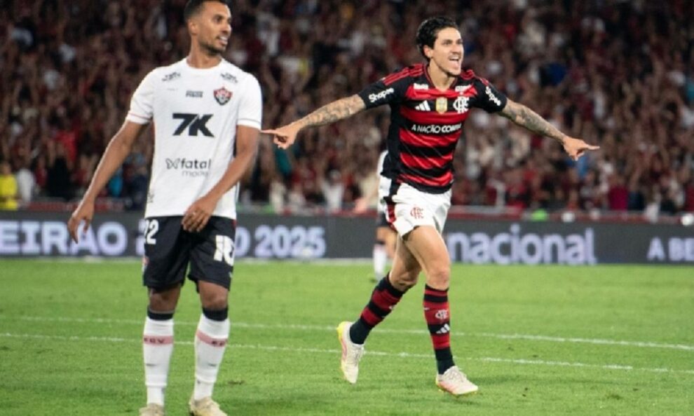 O Flamengo goleou, nesta terça-feira (26), o Vitória por 8 a 0 em partida válida pela 21ª rodada do Campeonato Brasileiro, no estádio do Maracanã. Com o resultado, o time carioca se mantém na liderança isolada da competição, com 46 pontos, quatro a mais que o segundo colocado, o Palmeiras. O time rubro-negro impôs um ritmo avassalador desde os primeiros minutos de jogo. Logo aos quatro minutos, a equipe já vencia por 2 a 0. Samuel Lino abriu o placar, marcando seu primeiro gol com a camisa do clube. Na sequência, Pedro ampliou com um toque de cobertura na saída do goleiro Lucas Arcanjo.