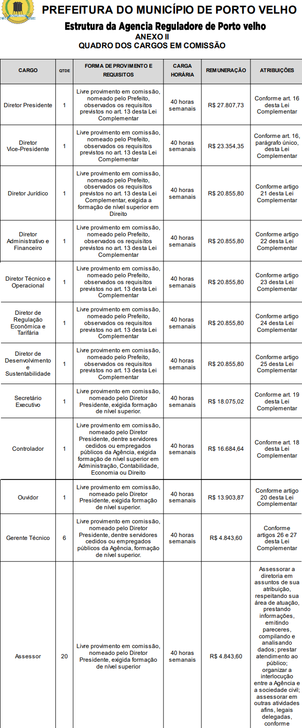 A Câmara Municipal aprovou o projeto de Lei do prefeito Léo Moraes Nº 09 , de 05 de maio de 2025. que Criou a Agência Reguladora dos Serviços Públicos Delegados e de Desenvolvimento do Município de Porto Velho – ARDPV, e com isso criou 36 cargos DAS, para nomeação com salários que variam de 27 mil para o presidente, até com a nomeação de 20 vinte assessores com salários de quase 5 mil Reais.
