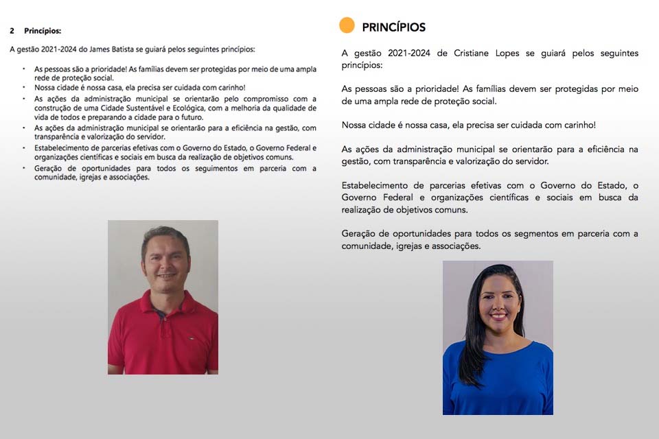 À esquerda, o início do Plano de Governo de Cristiane Lopes; do outro lado, as ideias socialistas de James Batista / Reprodução