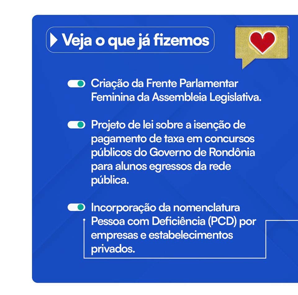 Neste curto período atuando na Casa de Leis, a parlamentar já alcançou relevantes conquistas, principalmente nos trabalhos focados nas causas sociais e em prol das crianças e adolescentes, mulheres em vulnerabilidade e pessoas com deficiências.
