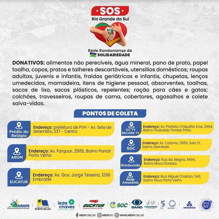 A Eucatur, empresa com 52 anos de atuação em Rondônia, será responsável pela logística da campanha (coleta e entrega das doações ao Rio Grande do Sul). O diretor da empresa, Airton Gurgacz, destacou a importância de embalar os produtos de forma organizada para facilitar o trabalho de recebimento e distribuição no estado gaúcho.
