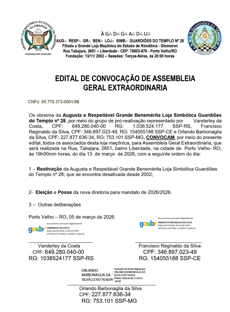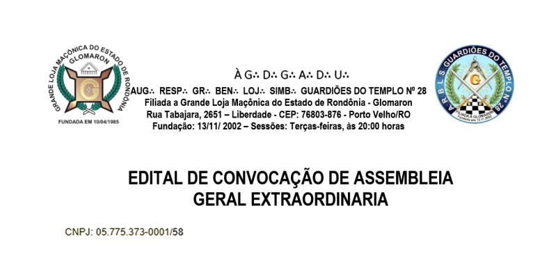 A Augusta e Respeitavel Grande Benemérita Loja Simbólica Guardiões do Templo 28, convoca por meio do presente edital, todos os associados para a Assembleia Geral Extra Ordinária que será realizada no dia 13 de Março de 2026, vejam o edital: