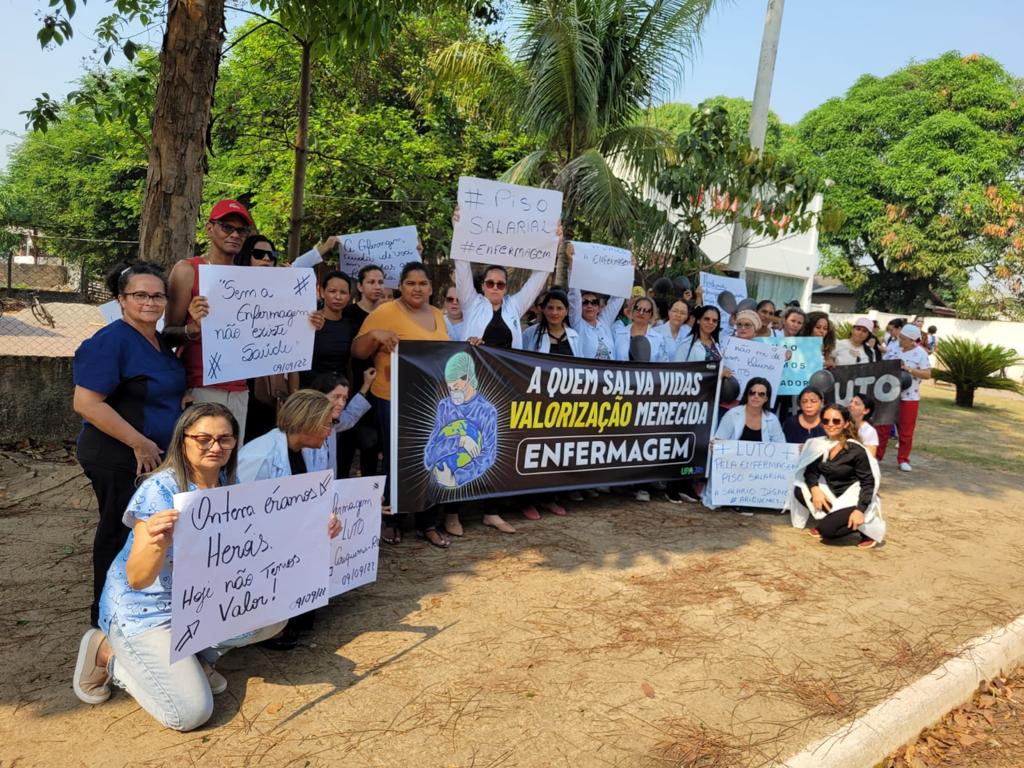 Profissionais de enfermagem de Rondônia se reuniram na manhã desta sexta-feira (9), em frente ao Hospital de Base Dr. Ary Pinheiro, em defesa do piso salarial da categoria, que foi suspenso temporariamente pelo Ministro Luís Roberto Barroso, pelo prazo de 60 dias, no último domingo (4). A Lei 14.3434/22, já havia sido sancionada pelo presidente da república e estabelecia o valor de R$ 4.750, para enfermeiros; R$ 3.325 para técnicos e R$ 2.375 para auxiliares e parteiras.