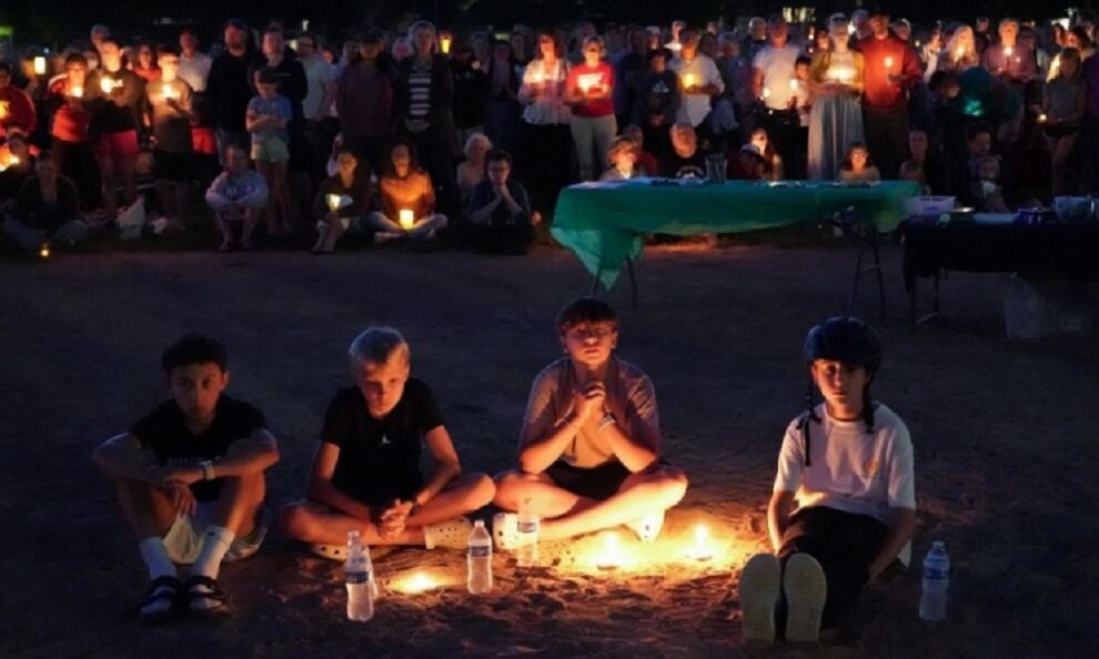 Crianças ouvem palestrantes durante uma vigília à luz de velas em um parque local pelo tiroteio na Escola Católica Annunciation em Minneapolis, Minnesota, EUA, em 27 de agosto de 2025