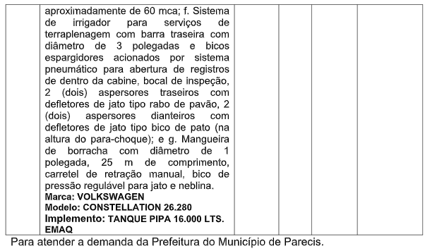 Para atender a demanda da Prefeitura do Município de Parecis.