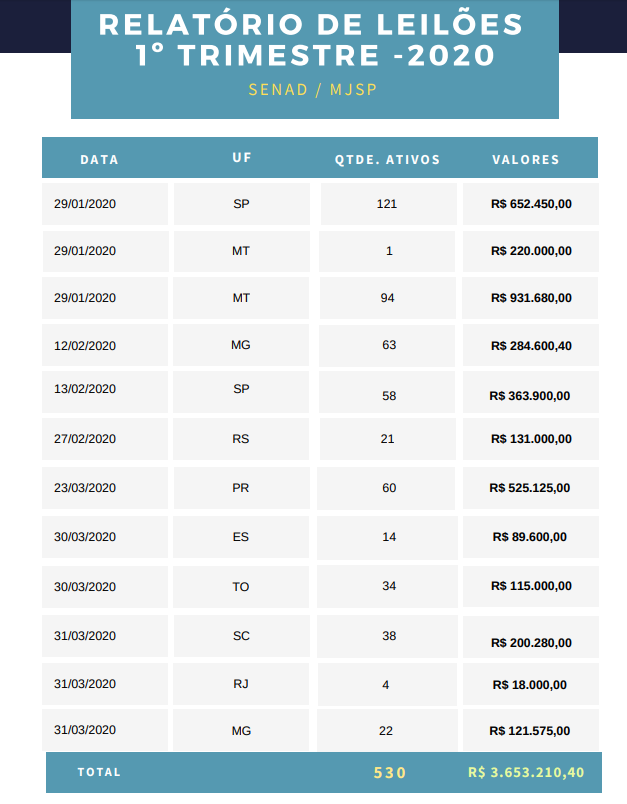 De acordo com a Senad, a previsão é que até o final do ano sejam realizados 100 leilões em todo o país, contemplando, até mesmo, a venda de imóveis oriundos de crime de tráfico de drogas, de lavagem de dinheiro e de corrupção.