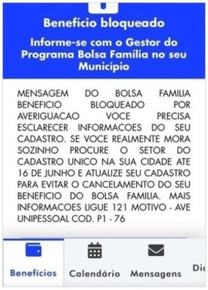 O beneficiário também pode verificar, no aplicativo do Bolsa Família, se o benefício foi bloqueado. Neste caso, a mensagem que vai aparecer é a da imagem abaixo: