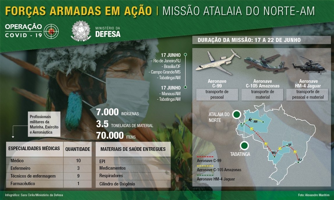 Além das equipes médicas, a missã vai entregar 30 mil máscaras cirúrgicas, 16 mil toucas, 12 mil aventais descartáveis, 400 unidades de máscaras N95, 3 mil aventais impermeáveis, 540 unidades de álcool etílico 70%, 1.320 unidades de testes rápidos para COVID-19, 300 protetores faciais, 500 unidades de macacões de proteção e diversos medicamentos, além de 16 ventiladores pulmonares, para o Hospital Municipal de Atalaia do Norte, que é referência de atendimento em toda a região do Vale do Javari, e e para o Distrito Sanitário Especial Indígena (DSEI) Vale do Javari, para atendimento nas aldeias.