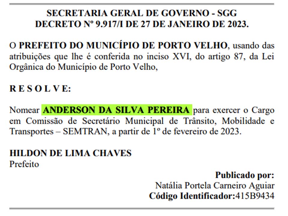 O deputado Anderson Pereira, do Republicanos, foi nomeado pelo prefeito de Porto Velho, Hildon Chaves, do União Brasil, como novo gestor da Secretaria Municipal de Trânsito (SEMTRAN).