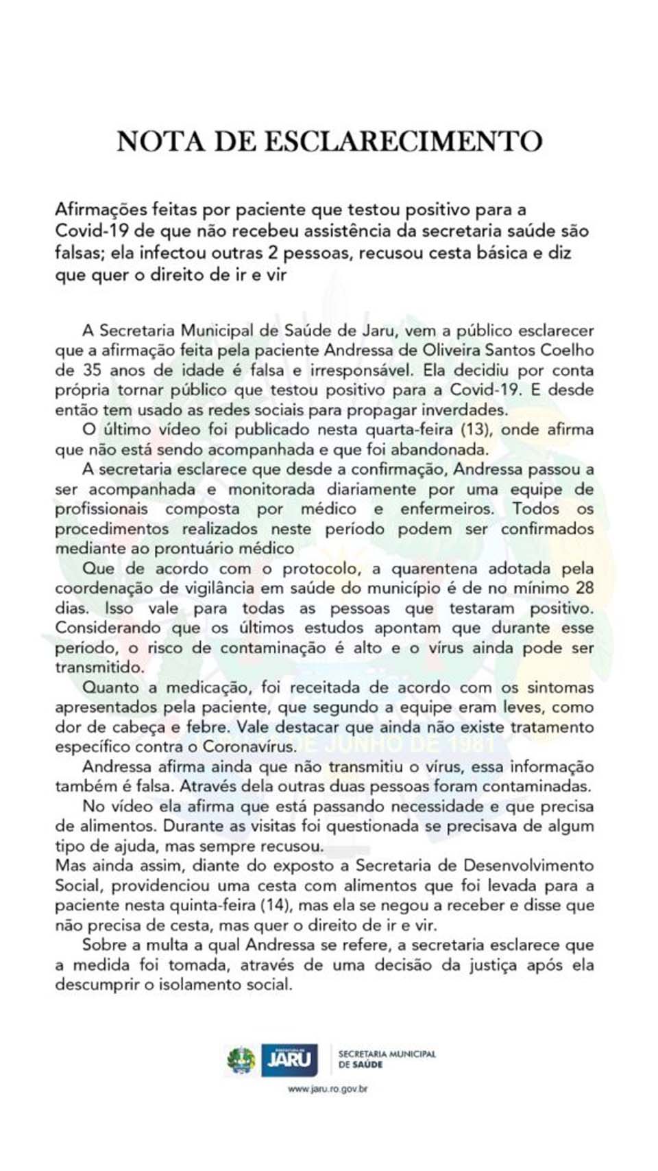A secretaria municipal de saúde de Jaru, vem a público esclarecer que a afirmação feita pela paciente é falsa e irresponsável. Esclarece ainda que desde a confirmação, Andressa passou a ser acompanhada e monitorada diariamente por uma equipe de profissionais composta por médico e enfermeiros. Todos os procedimentos realizados neste período podem ser confirmados mediante ao prontuário médico.