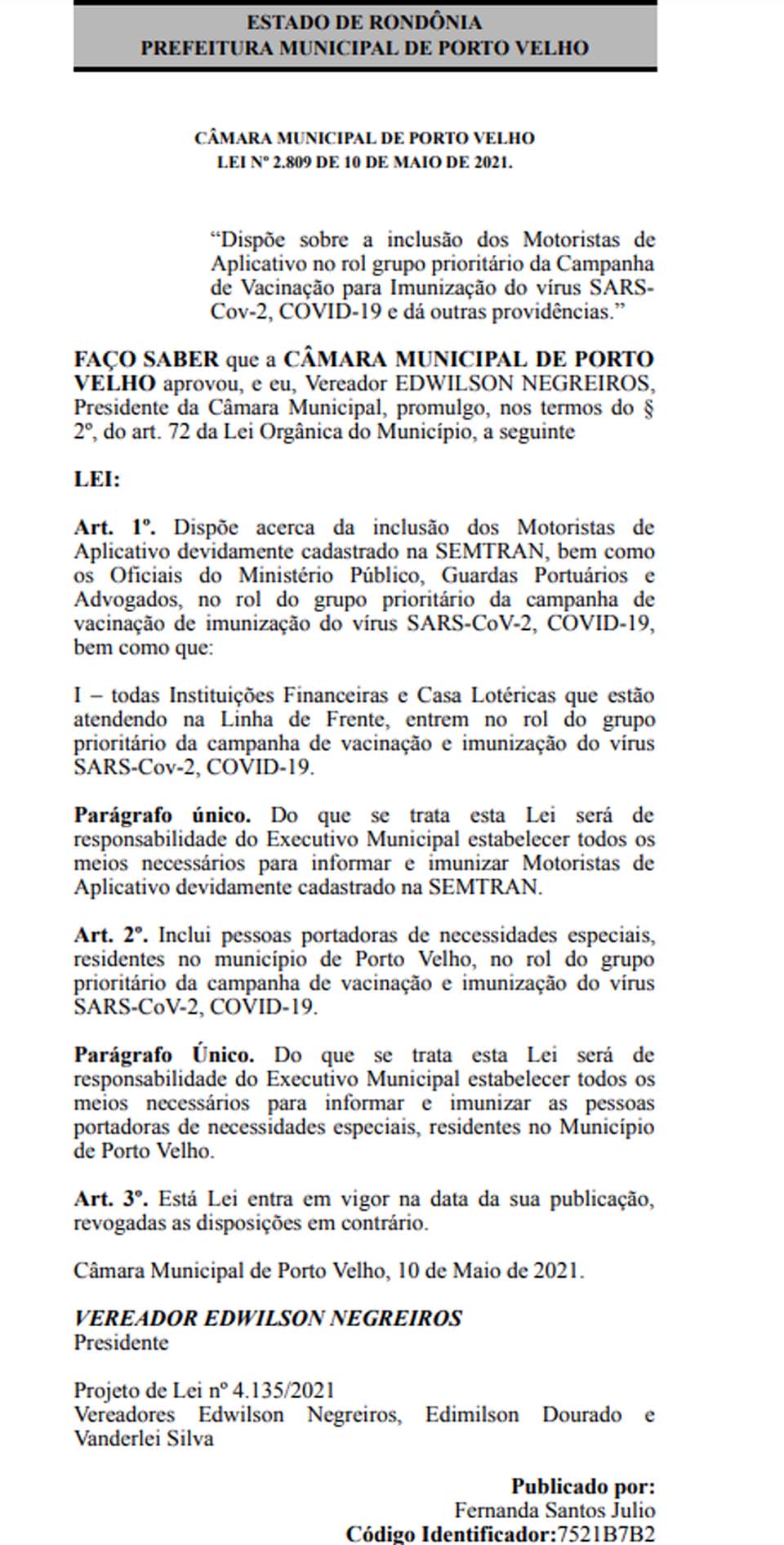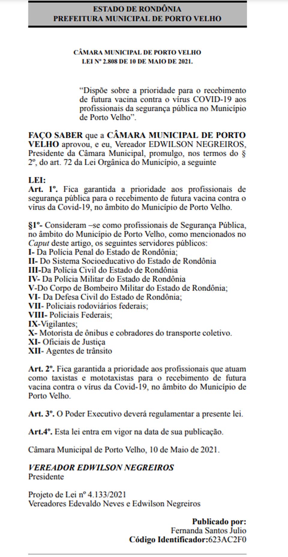Este projeto específico, que também virou lei após aprovação por parte dos membros da Câmara de Porto Velho, trouxe para dentro da ramificação prioritária da vacina contra o Coronavírus os motoristas de aplicativo devidamente cadastrados na Secretaria Municipal de Trânsito (SEMTRAN).
