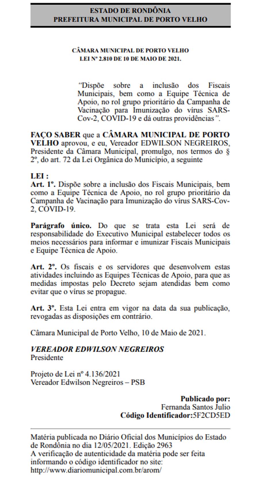 Por fim, o projeto derradeiro que se firmou também como dispositivo legal eficaz trata a respeito dos fiscais municipais e Equipe Técnica de Apoio, todos elevados ao rol prioritário dos imunizantes contra a COVID-19.