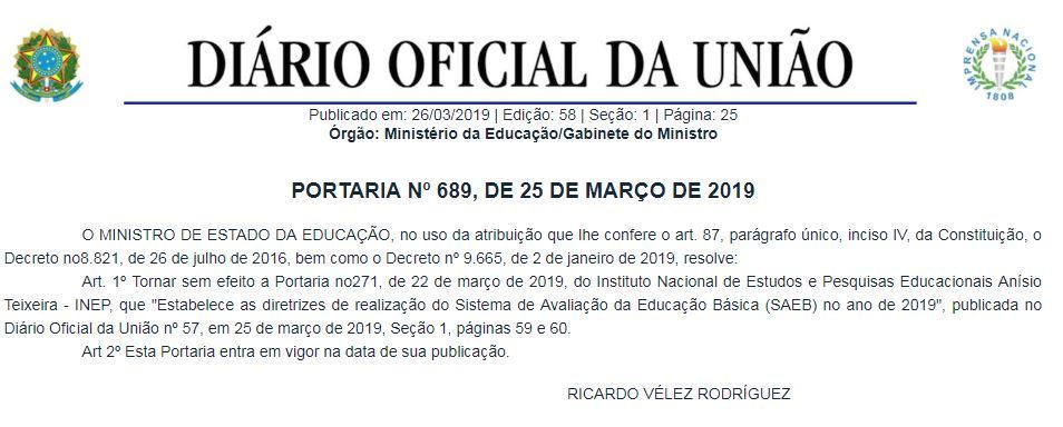 A portaria havia sido publicada na segunda-feira (25), determinando que o Saeb (Sistema de Avaliação do Ensino Básico) avaliasse todas as escolas públicas e uma amostra das escolas privadas, que oferecem 5º e 9º ano do Ensino Fundamental, e a 3ª e 4ª série do Ensino Médio.