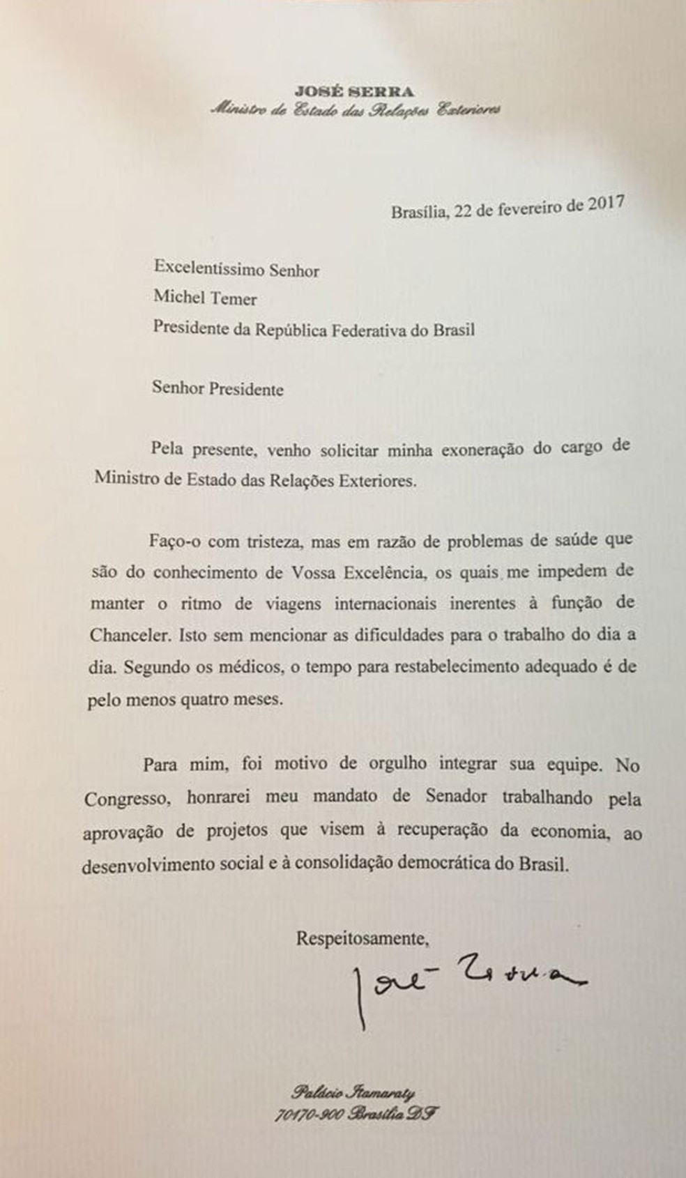 Na carta enviada ao presidente Michel Temer, Serra disse que decidiu deixar a pasta “em razão de problemas de saúde” – veja a reprodução da carta ao final desta reportagem.