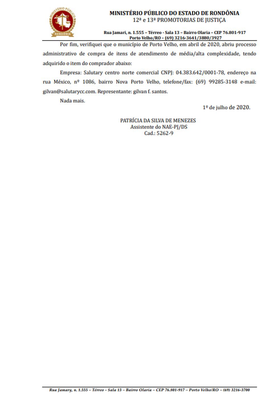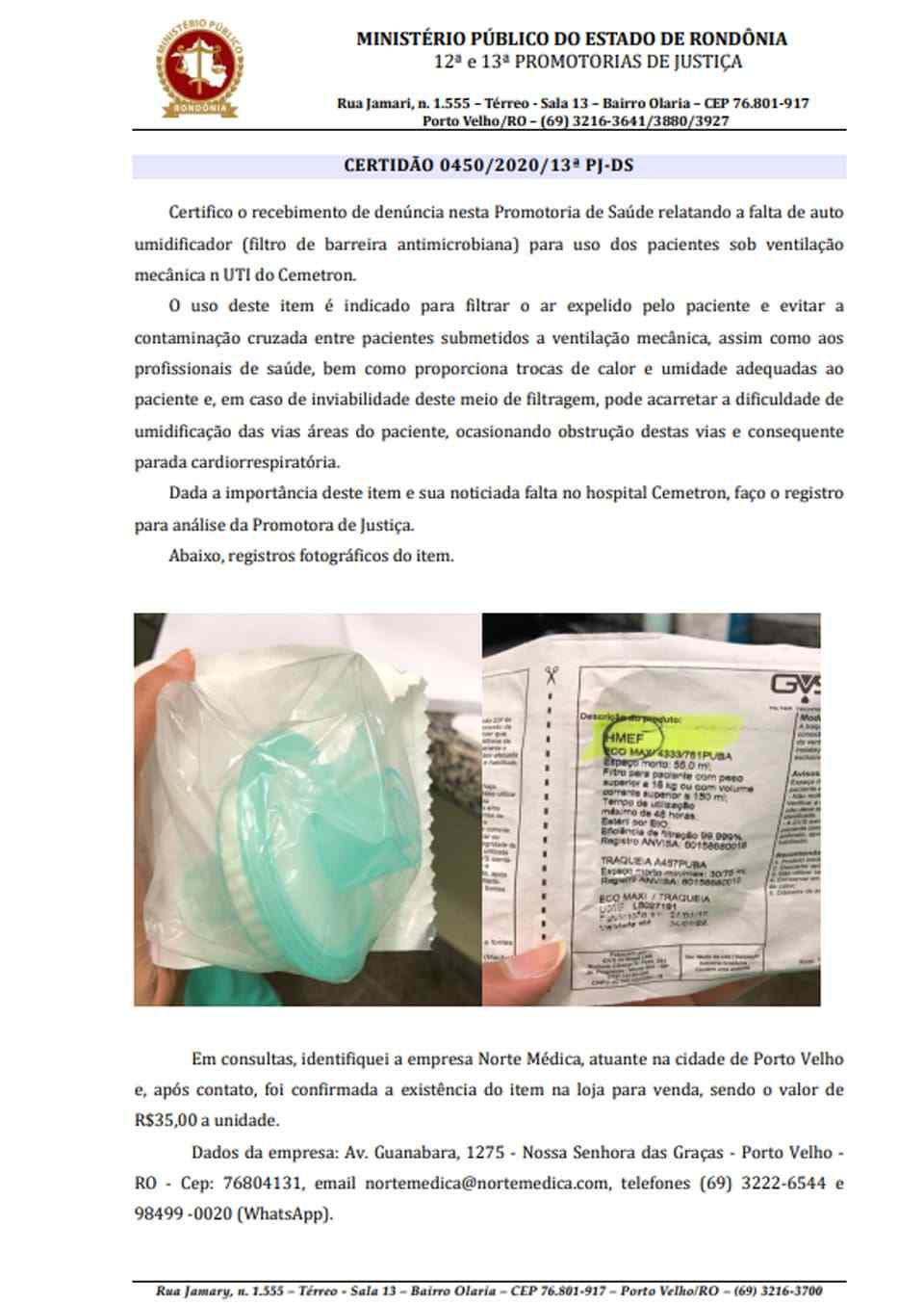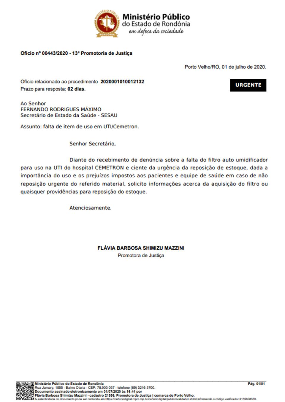 “[…] a falta do filtro auto umidificador para uso na UTI do hospital CEMETRON e ciente da urgência da reposição de estoque, dada a importância do uso e os prejuízos impostos aos pacientes e equipe de saúde em caso de não reposição urgente do referido material, solicito informações acerca da aquisição do filtro ou quaisquer providências para reposição do estoque […]”.