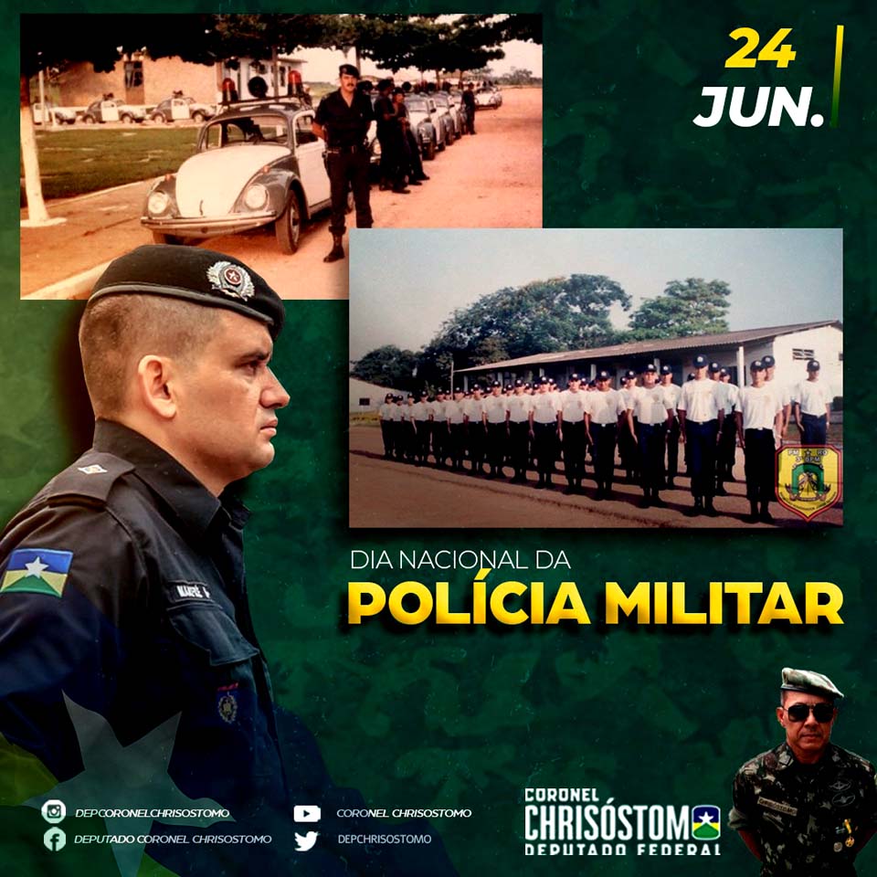 O deputado Federal por Rondônia, Coronel Chrisóstomo, usou sua rede social, nesta quinta-feira (24), data em que se comemora o dia Nacional do Polícial Militar, para homenagear a categoria, profissionais da Segurança, que têm a árdua missão de proteger a sociedade, no combate a criminalidade e no cumprimento da Lei e da ordem pública.