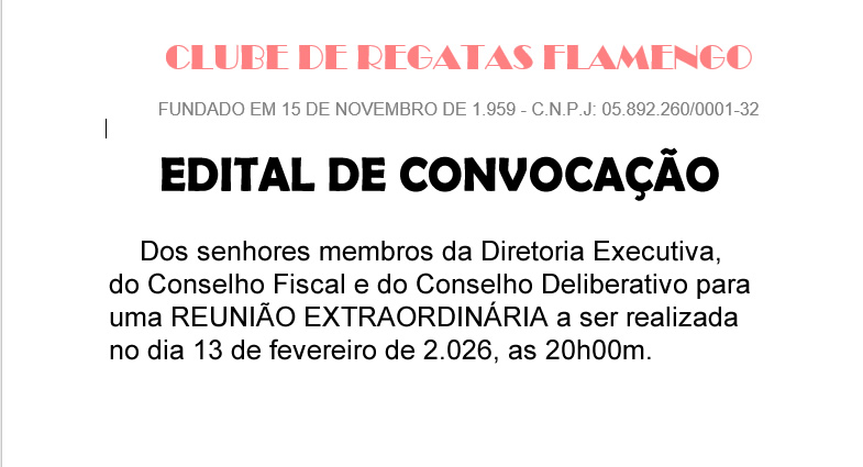 O Presidente do CLUBE DE REGATAS FLAMENGO DE PORTO VELHO/RO, convocou os senhores membros da Diretoria Executiva, do Conselho Fiscal e do Conselho Deliberativo para uma REUNIÃO EXTRAORDINÁRIA a ser realizada no dia 13 de fevereiro de 2.026, as 20h00m., na sede do Clube, sito a Av. Farquar nº. 2.455, Bairro Arigolândia, para tratar dos seguintes assuntos: