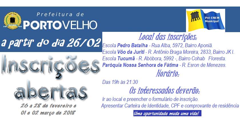 A abertura das inscrições para o Pré-Enem 2018 se iniciará dia 26 de fevereiro e se estenderá até o dia 02 de março de 2018, nos seguintes locais: