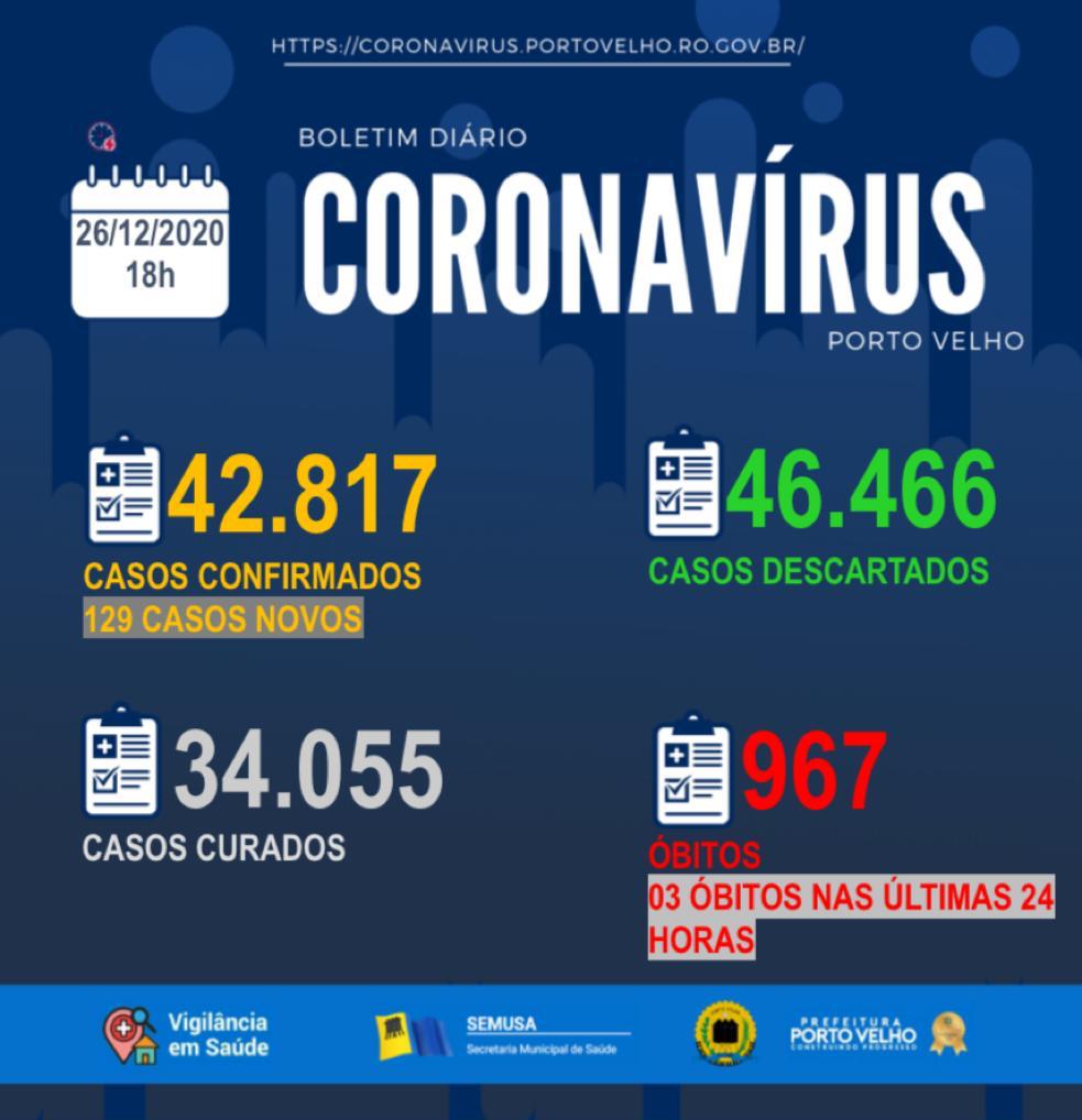 A capital Porto-Velhense registrou hoje (26/12) por meio da Agência Estadual de Vigilância Sanitária e a Secretaria Estadual da Saúde (Sesau), divulga os dados referentes ao coronavírus (Covid-19) no Município.