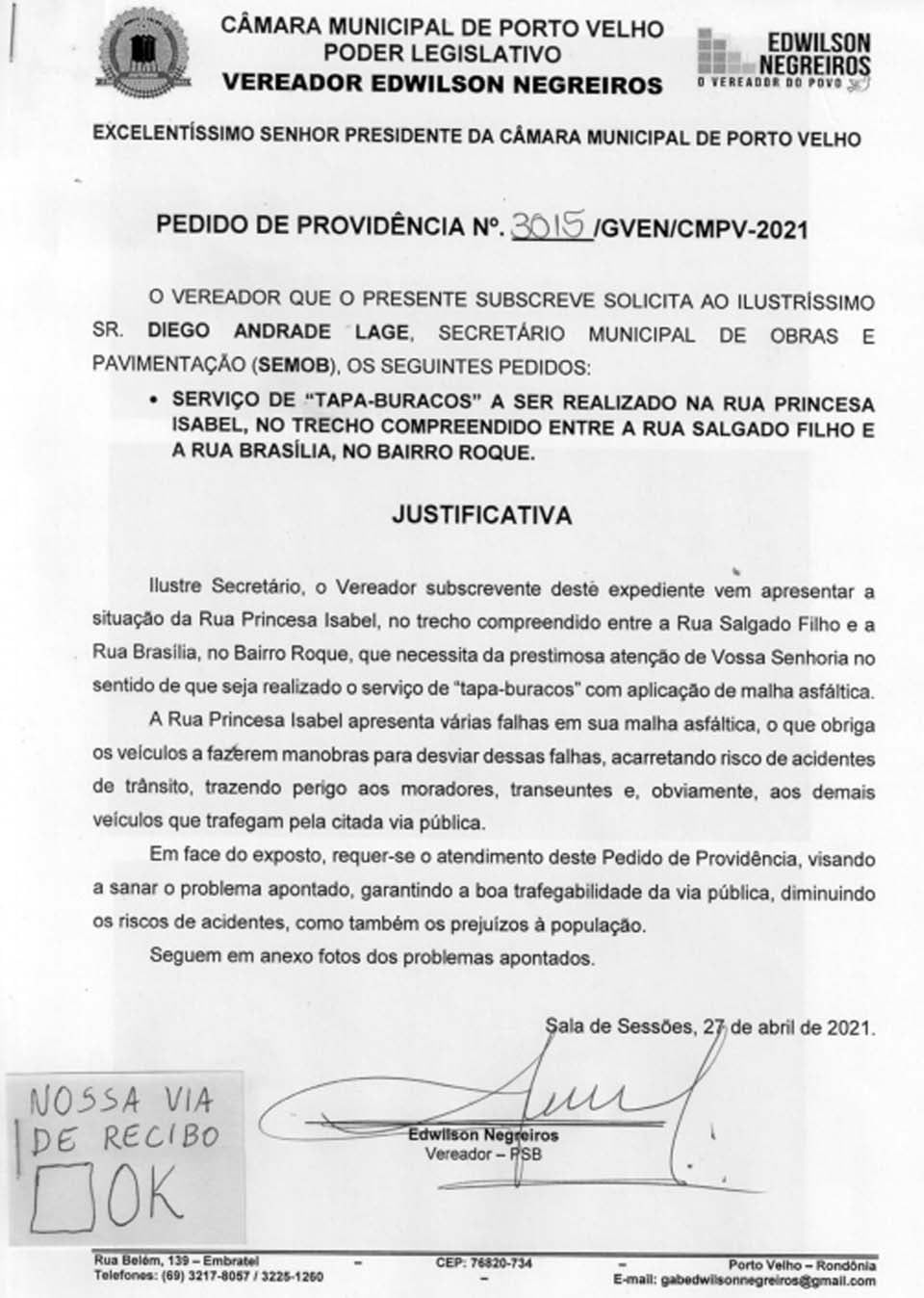 “É importante que a sociedade nos acione através do Gabinete Online a fim de que possamos enviar esses reclames à Prefeitura de Porto Velho. Aliás, além de encaminhá-las como tem de ser, nossa função como vereador é acompanhar tudo e fiscalizar de perto. Agora a Rua Princesa Isabel tem condições de trafegabilidade e certamente o conserto trará mais segurança aos motoristas”, destacou Negreiros.