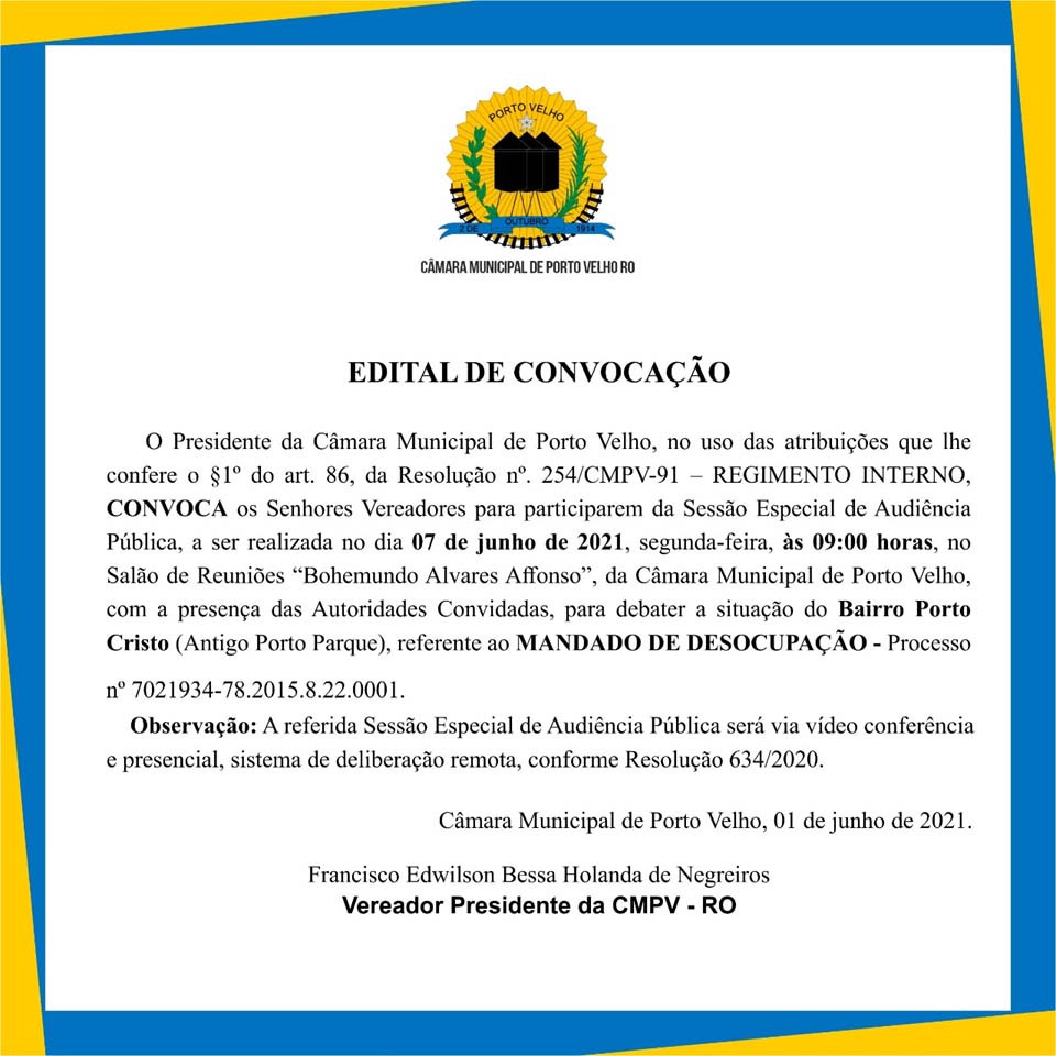 O presidente da Câmara Municipal de Porto Velho Edwilson Negreiros, do PSB, determinou a convocação de sessão especial de audiência pública a fim de debater o mandado de desocupação no Bairro Porto Cristo expedido pela Justiça de Rondônia.