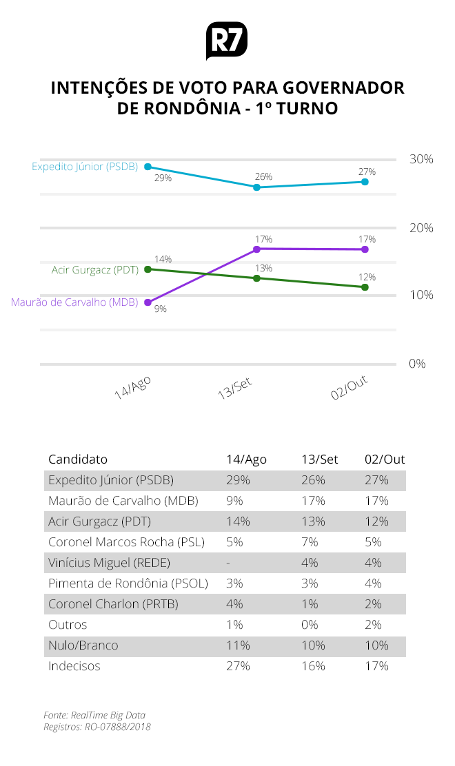 O candidato do PSDB ao governo de Rondônia, Expedito Júnior, segue na liderança da corrida com 27% das intenções de voto, revelou uma pesquisa divulgada nesta terça-feira (2), pelo instituto RealTime Big Data.
