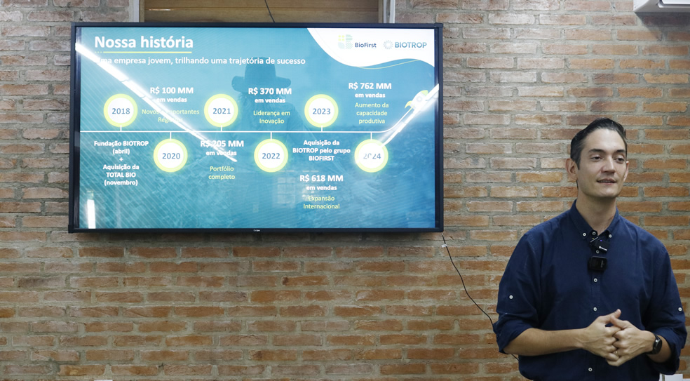 Jonas falou que a BIOTROP está encontra na vanguarda do desenvolvimento dos Insumos Biológicos e Naturais, sendo o Brasil destaque na Produção Cientifica no que se refere a Insumos Biológicos com investimentos massivos em inovação, pesquisa, desenvolvimento e registros;