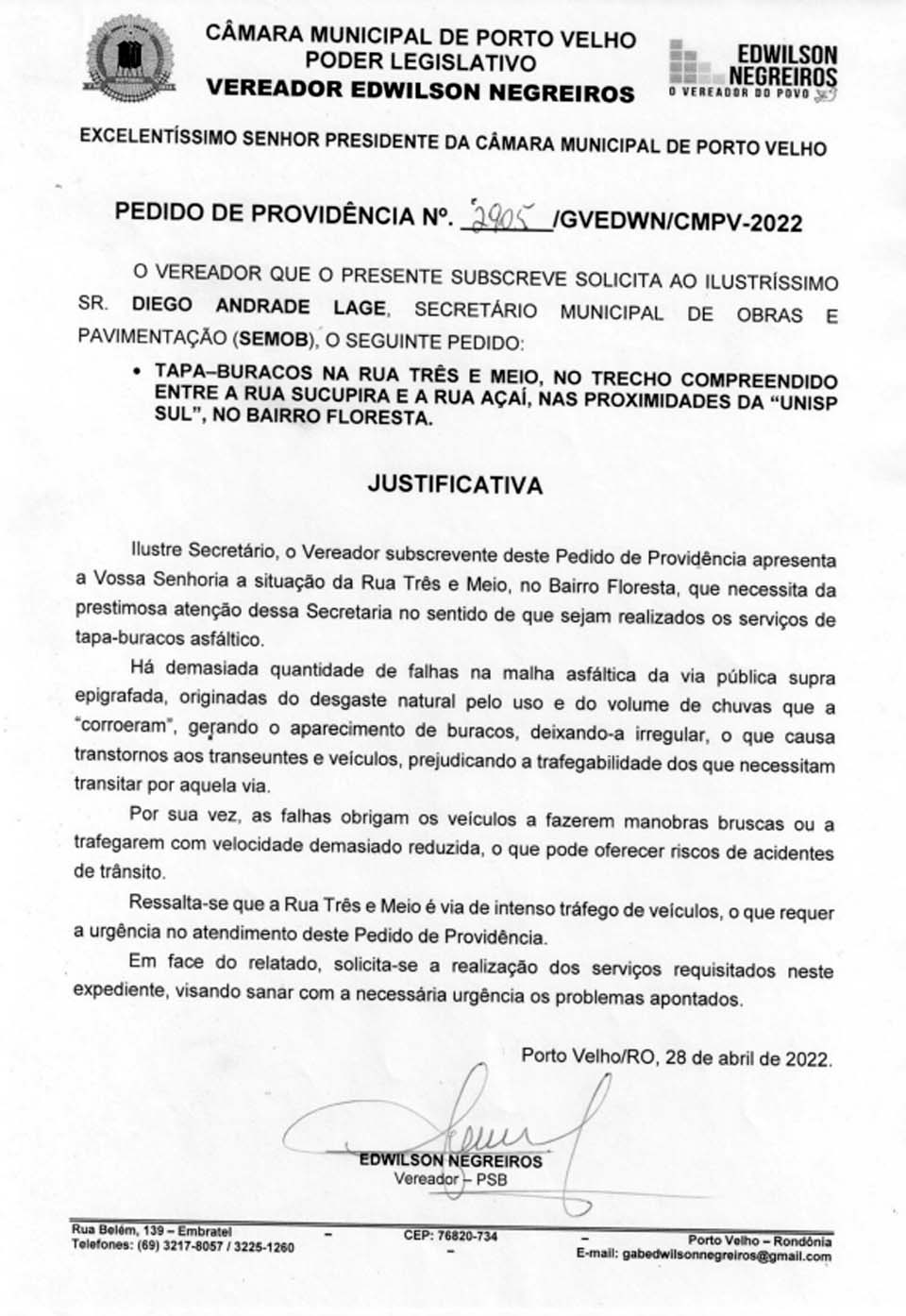 Desta feita, o Ofício encaminhado ao titular da secretaria Municipal de Obras e Pavimentação (SEMOB), Diego Lage Andrade, abordou a necessidade de promoção de serviços voltados à operação tapa-buracos na Rua Três e Meio entre Sucupira e Açaí, Bairro Floresta, zona Sul.
