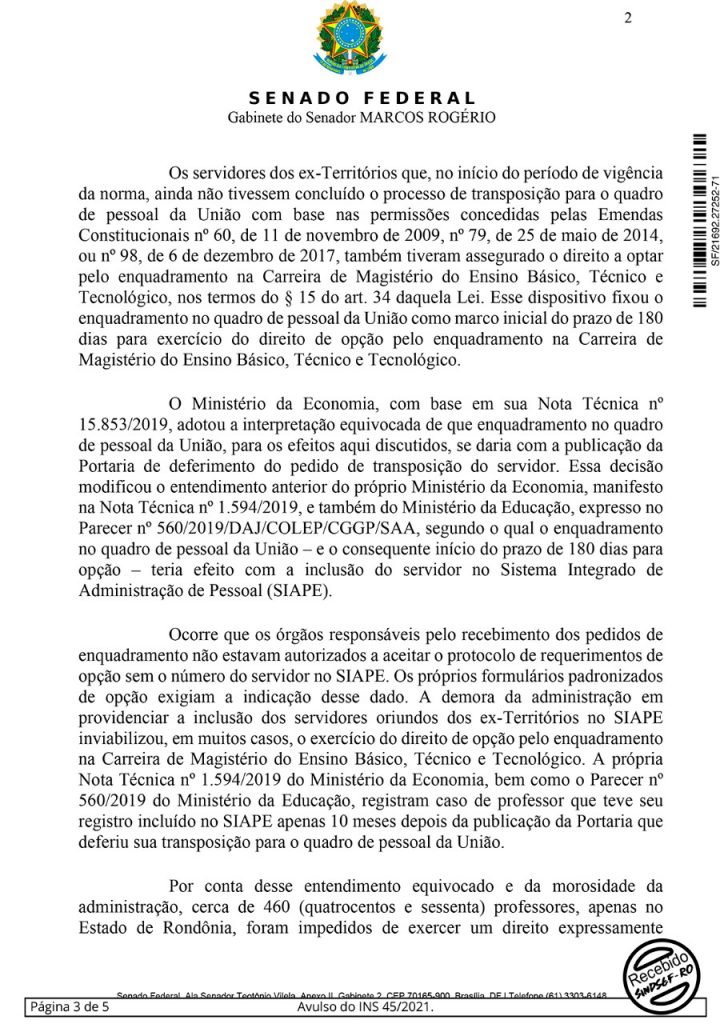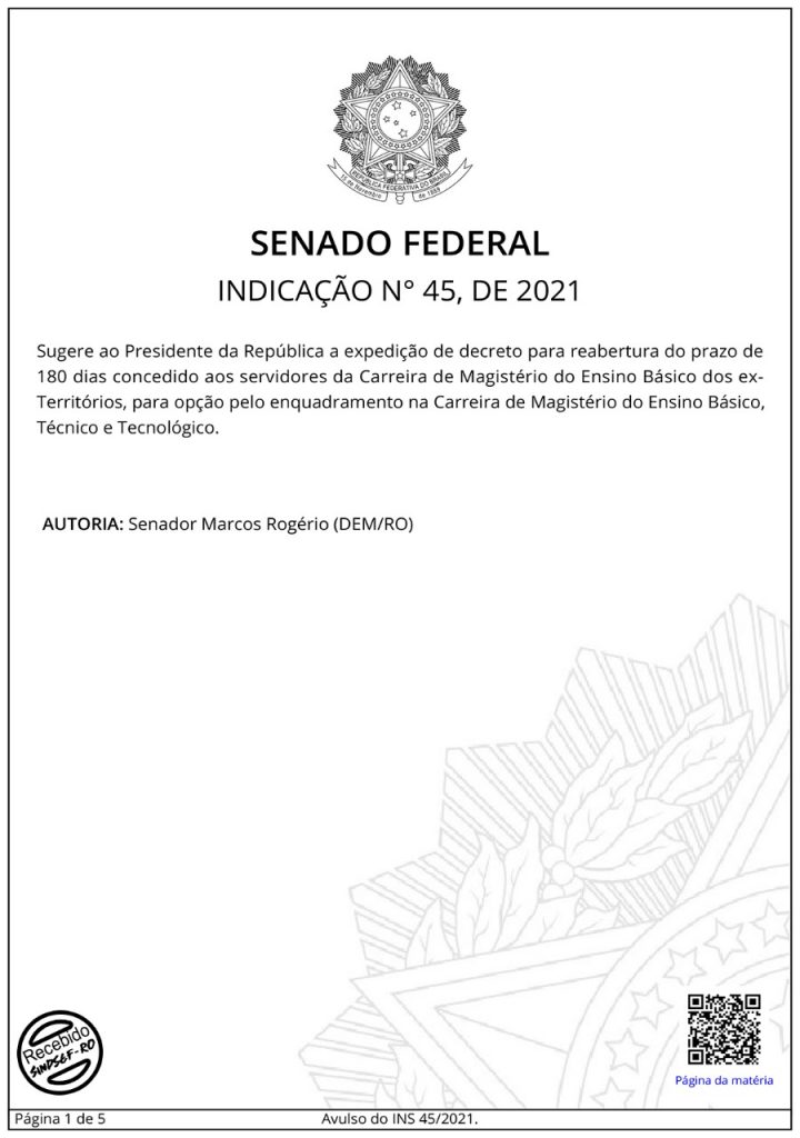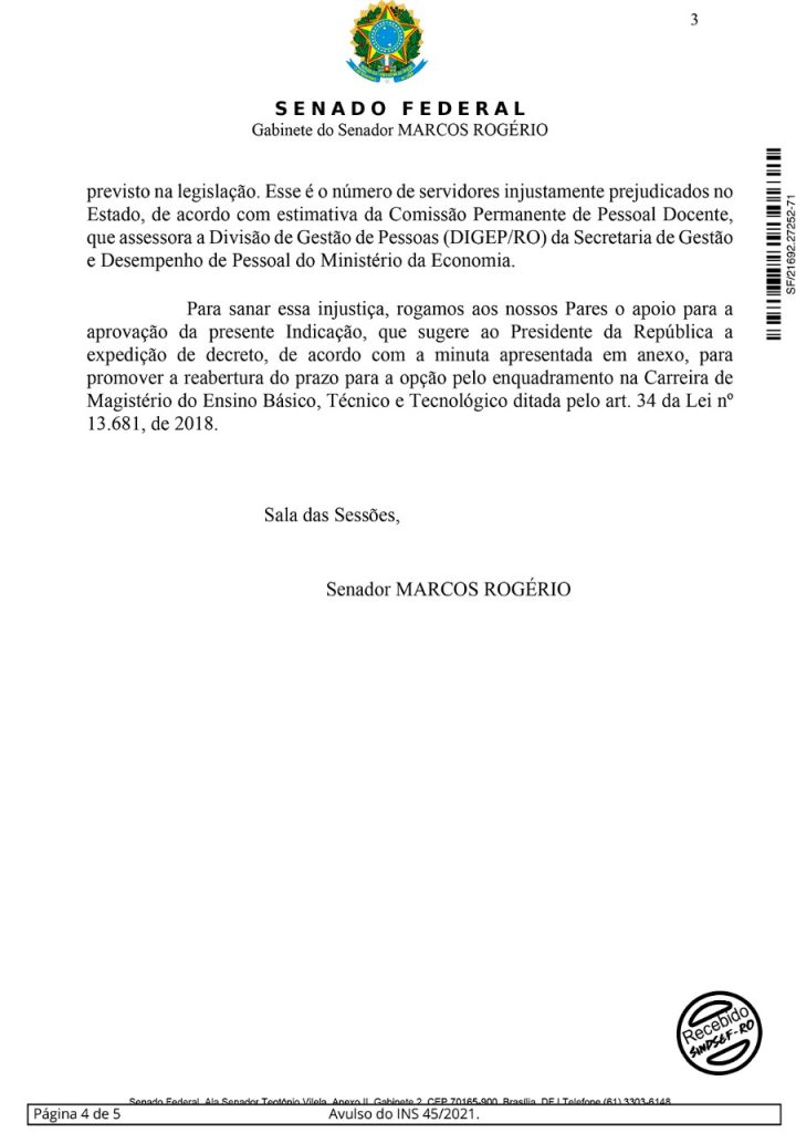 O senador Marcos Rogério apresentou na tarde desta tarde desta quinta-feira (15/07), uma indicação pedindo ao Presidente da República, Jair Bolsonaro, a expedição de decreto que promova a reabertura do prazo de 180 dias para que os professores dos ex-Territórios possam fazer a opção de enquadramento na Carreira de Magistério do Ensino Básico, Técnico e Tecnológico (EBTT).