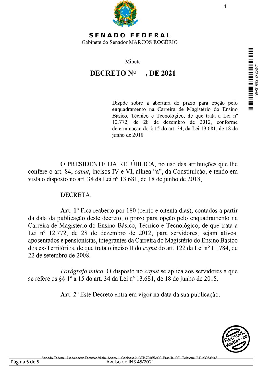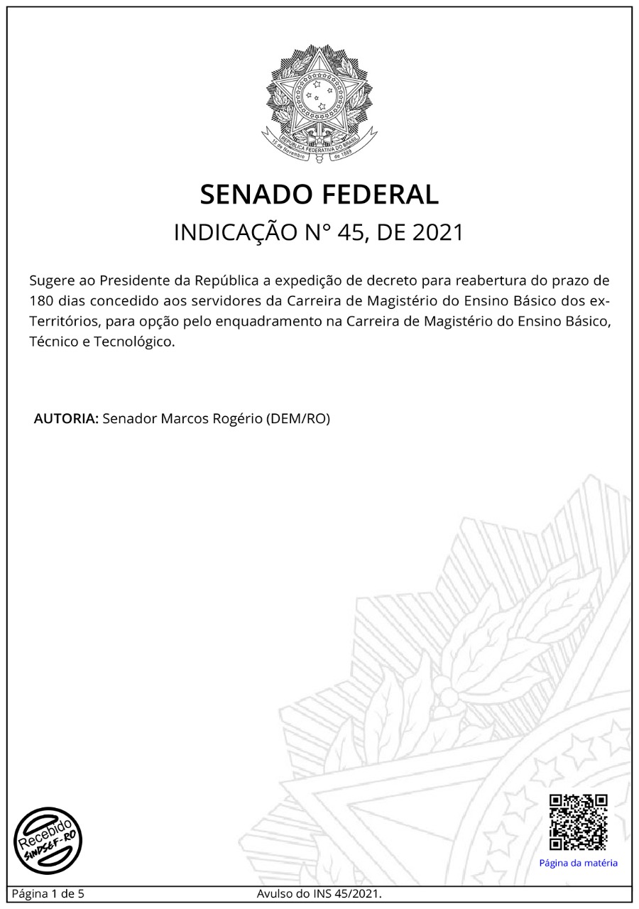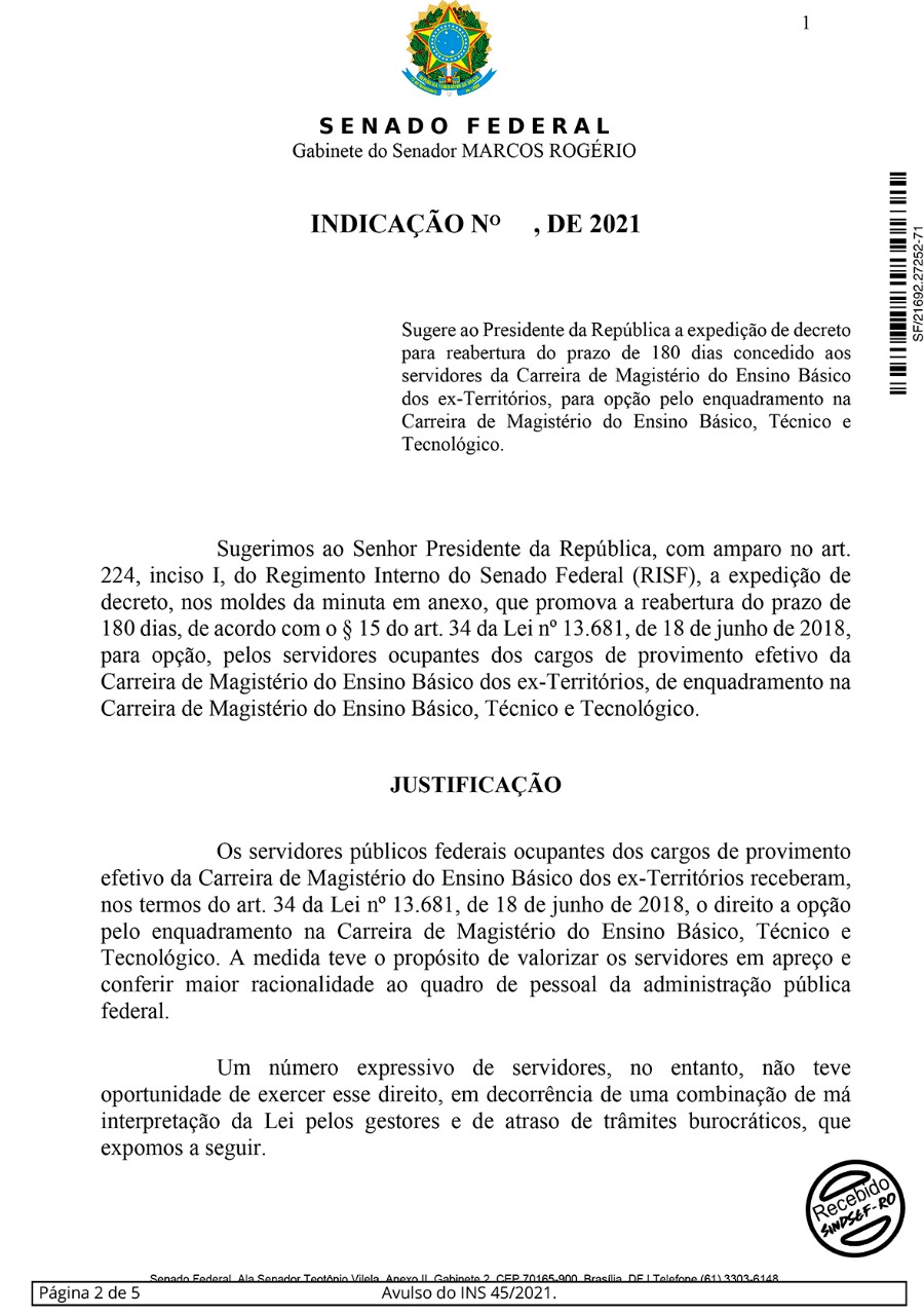 O senador Marcos Rogério apresentou na tarde desta tarde desta quinta-feira (15/07), uma indicação pedindo ao Presidente da República, Jair Bolsonaro, a expedição de decreto que promova a reabertura do prazo de 180 dias para que os professores dos ex-Territórios possam fazer a opção de enquadramento na Carreira de Magistério do Ensino Básico, Técnico e Tecnológico (EBTT).