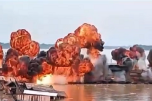 Embarcação ou plataforma flutuante costuma ser equipada e usada para extrair minério do leito de rios Uma operação integrada contra o garimpo ilegal no Rio...