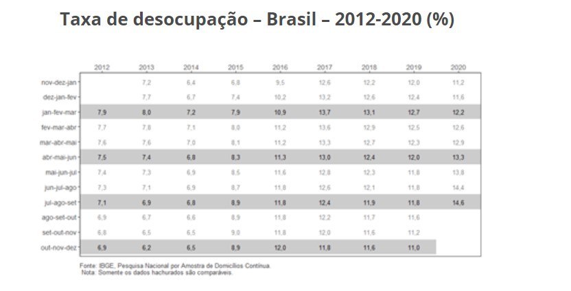 A taxa de desocupação chegou a 14,6% no trimestre encerrado em setembro, atingindo o maior patamar da série histórica, que começou em 2012, de acordo com Pnad Contínua (Pesquisa Nacional por Amostra de Domicílios Contínua), divulgada nesta sexta-feira (27) pelo IBGE (Instituto Brasileiro de Geografia e Estatística).
